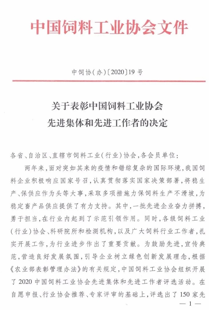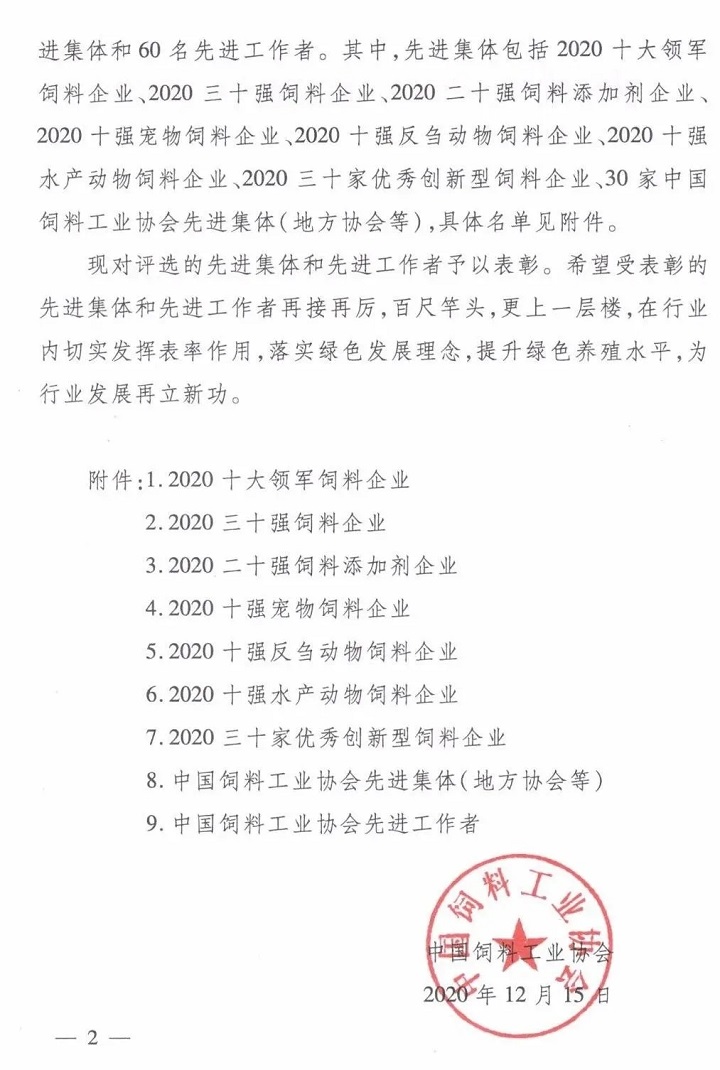 【喜訊】大禹生物榮獲2020全國(guó)二十強(qiáng)飼料添加劑企業(yè)稱號(hào)