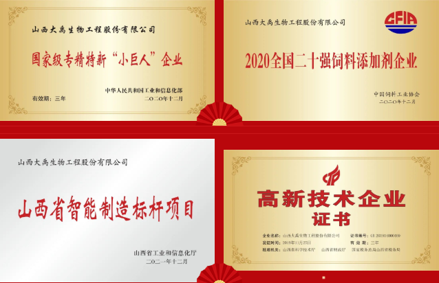 大禹生物成立于2014年,主營業(yè)務(wù)為飼料添加劑、飼料及獸藥的研發(fā)、生產(chǎn)與銷售。先后榮獲國家級專精特新“小巨人”企業(yè)、全國二十強飼料添加劑企業(yè)、山西省智能制造標(biāo)桿項目、山西省質(zhì)量獎提名獎、山西省企業(yè)技術(shù)創(chuàng)新獎等榮譽。