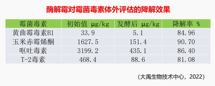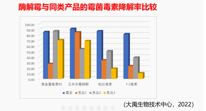 大禹生物的生物降解霉菌毒素產(chǎn)品是通過復(fù)合微生態(tài)制劑來表達(dá)氧化還原酶(去氧環(huán)化酶)、水解酶、轉(zhuǎn)移酶等霉菌毒素降解酶,降解霉菌毒素的毒性基團(tuán)、破壞霉菌毒素活性中心,致使霉菌毒素毒性變?nèi)趸蜃兂蔁o毒物質(zhì)。