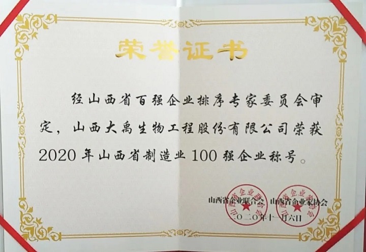 大禹生物榮獲山西省制造行業(yè)100強榮譽稱號。