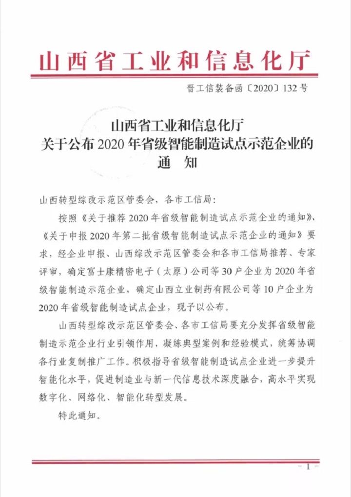 【喜訊】大禹生物榮獲山西省2020年省級智能制造示范企業(yè)榮譽稱號