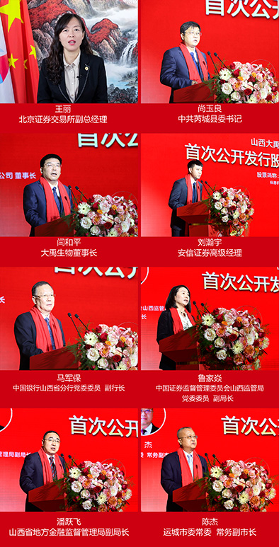 同時,還有大禹生物股東代表、董事、監(jiān)事、高管代表、特邀代表,中介機構、客戶代表、員工代表,以及在大禹生物發(fā)展過程中予以我們支持、幫助、合作的各界伙伴,人民日報、新華社、中央電視臺、上海證券報、證券時報、山西日報、山西電視臺、山西新聞網(wǎng)等媒體的記者朋友。北京證券交易所副總經(jīng)理王麗女士通過視頻連線發(fā)來祝賀。